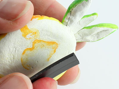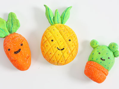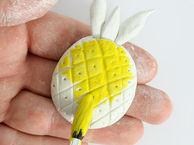 Commencer par aplatir la pâte avec le rouleau, puis, à l’aide d’un cure-dent, dessiner des lignes verticales et un sourire. Astuce : pour ajouter un nez ou des yeux à votre ananas, utiliser des boules de pâte plus petites et peindre des sourcils.