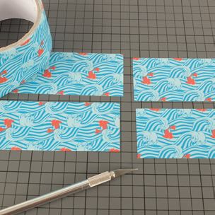 • Couper 3 bandes de Queentape à motifs de 9 cm environ. En placer une face collante dessus.