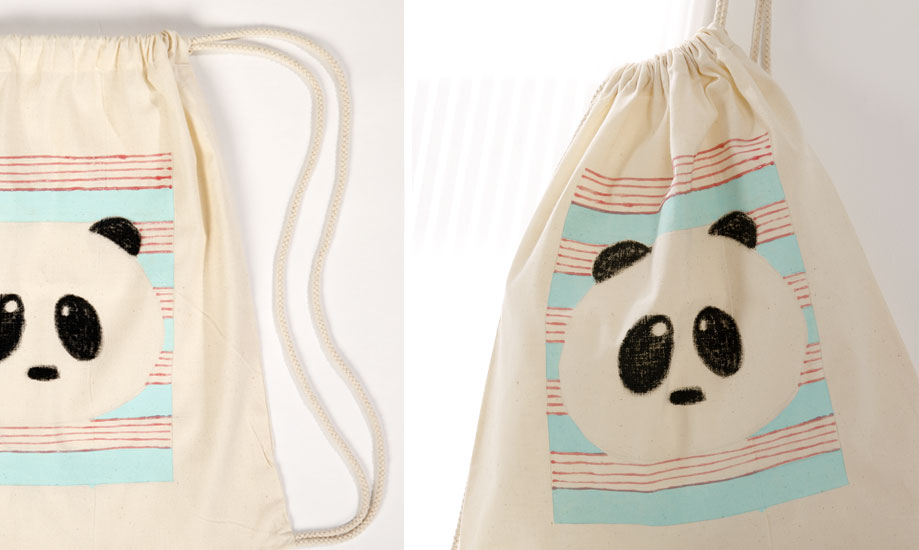 Dessiner une jolie tête de panda au centre du rectangle avec un crayon graphite Colorier le nez, les yeux et les oreilles à l’aide de la gouache solide pour textile.