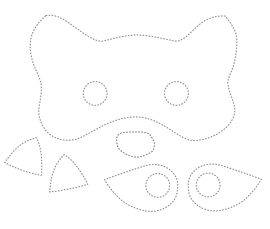 Découper les formes selon les contours, puis évider l’emplacement pour les yeux. Tracer les contours des différents éléments du masque sur les feuilles de feutrine et de tissu adhésives choisies.