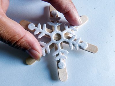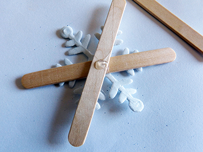 • Prendre trois bâtonnets et deux flocons de neige. Encoller l’arrière du flocon et déposer un bâtonnet. Faire de même pour les autres bâtonnets.