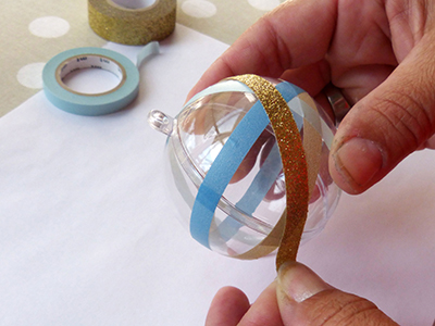 • Décorer 2 petites boules transparentes avec des rubans adhésifs fins.