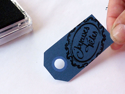 • Tremper le tampon « joyeuses fêtes » dans de l’encre noire et en reproduire le dessin sur une étiquette bleue. Réserver.