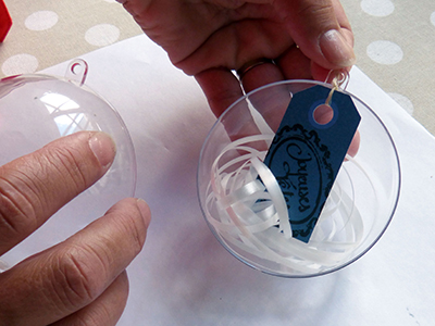 • Installer l’étiquette avec un bout de raphia que l’on coincera en refermant l’autre demi-sphère.