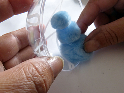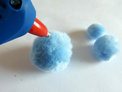 • Prendre 3 pompons bleus de 3 tailles différentes et les assembler du plus grand au plus petit avec le pistolet à colle.