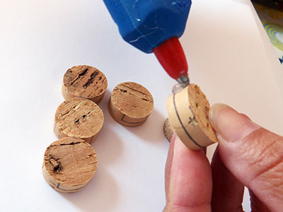 • Couper 6 rondelles de liège d’environ 1cm d’épaisseur. Avec le pistolet à colle, les assembler de façon suivante : 3 en haut, 2 au milieu et 1 en bas.