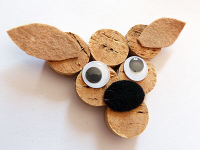 • Dans la feutrine marron, découper deux formes de feuilles pour les oreilles et dans la feutrine noire, une forme ovale pour le museau. Les coller à leur emplacement, ainsi que les yeux mobiles.