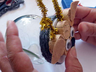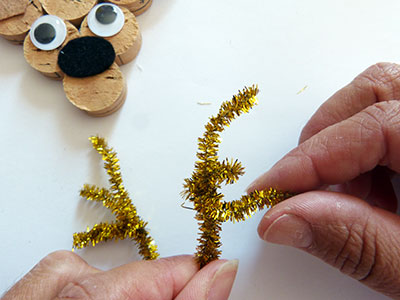 • Travailler la chenille dorée pour former des cornes à 3 branches puis les coller à l'arrière de la tête.