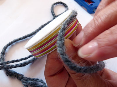 • Faire une tresse avec la laine grise d'une longueur d’environ 3 fois le diamètre du couvercle et la coller sur le rebord de celui-ci (mettre un point de colle au départ et à la fin pour maintenir la tresse).