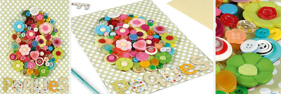 Sélectionner les boutons par taille. Les disposer en commençant par coller les plus gros, puis les moyens de façon à ce qu’il se touchent tout en chevauchant les gros boutons et enfin, coller les petits.