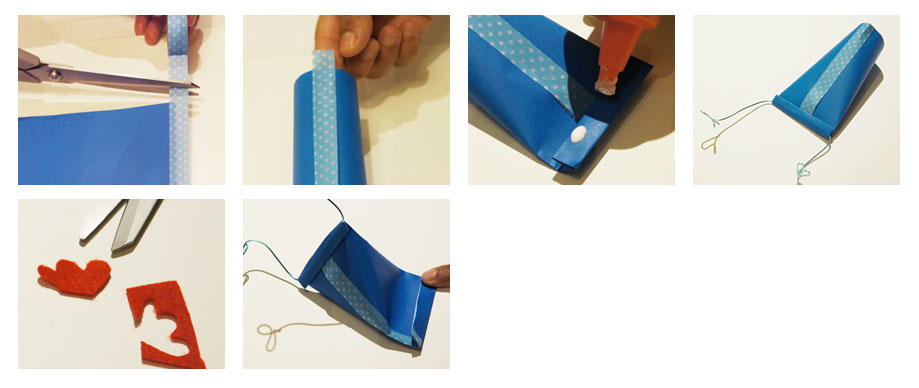 • Rabattre la partie supérieure du cône, puis y coller les différents éléments en feutrine. Pour terminer, coller les gommettes yeux.