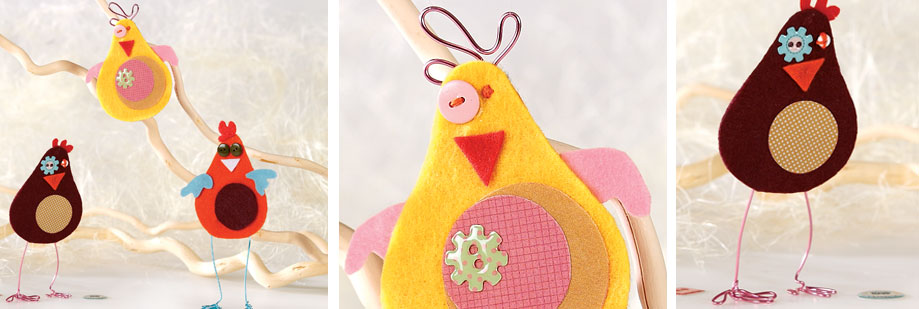 Il ne reste plus ensuite qu’à coller les ailes, la crête, le bec, ainsi que les boutons en guise d’yeux, pour finaliser cette jolie cocotte !