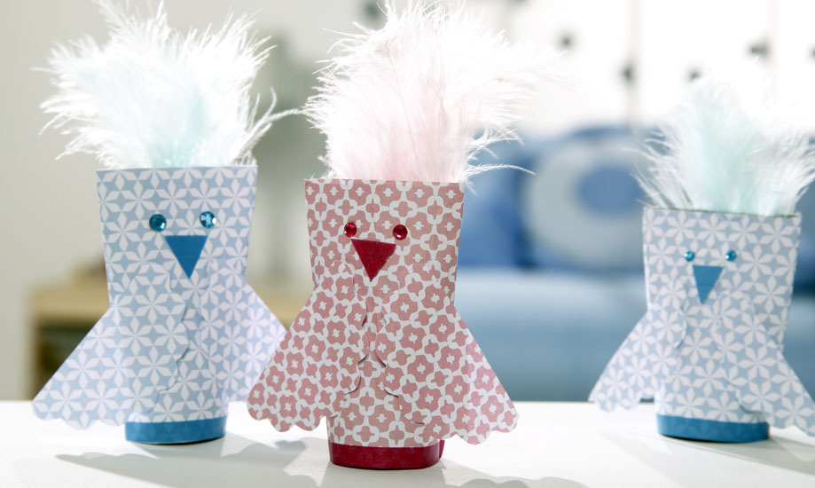 • Commencez par recouvrir votre rouleau avec le papier à motif. À l’aide du gabarit, découpez puis collez les ailes des oisillons.