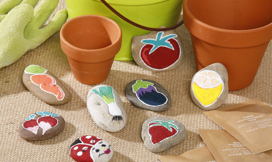• Sur les galets, tracez au crayon de graphite les contours des fruits et légumes correspondant à vos plantations.