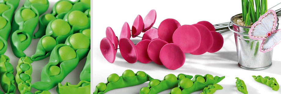Modelez la pâte en fonction de l’objet choisi. Pour des formes régulières, vous pouvez utiliser des emporte-pièces : ceux en métal sont particulièrement bien adaptés à la pâte FIMO. Pour les petits pois, nous vous conseillons d’utiliser 2 nuances différentes de verts. Et pour qu’ils soient réguliers, vous pouvez utiliser la machine « à fabriquer des perles ».