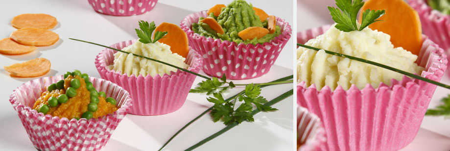 • Remplir une poche à douille avec chacune des purées. Garnir chaque cupcake avec une purée différente.