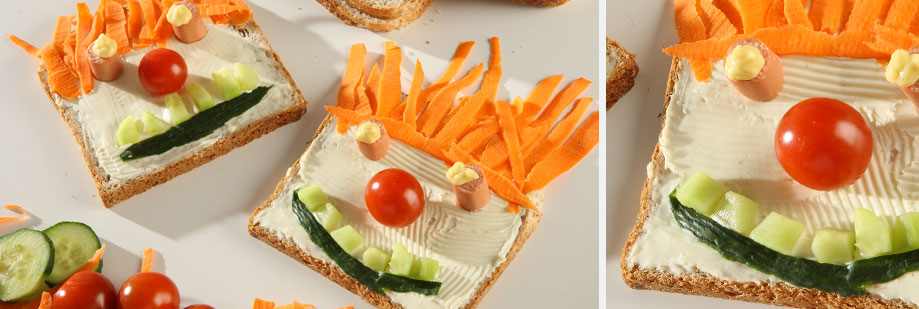 • Râper la carotte et mélanger avec le reste de vinaigrette et disposer sur le haut de la tartine pour faire les cheveux.