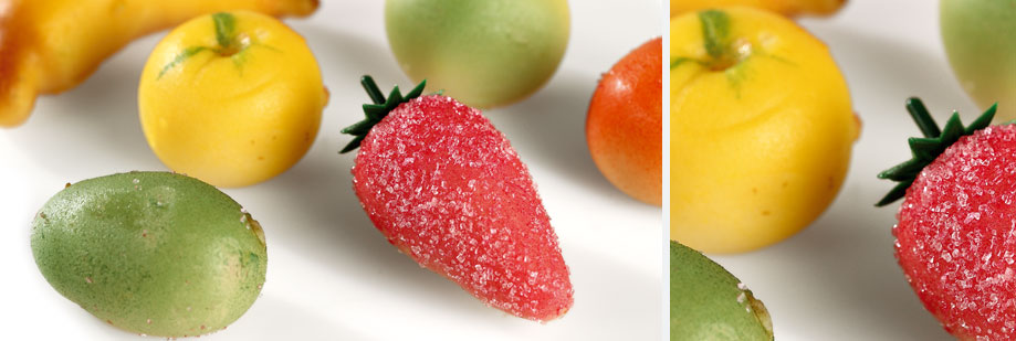 Modeler la pâte d’amande pour obtenir des fruits et légumes. Utiliser les ébauchoirs pour les finitions.